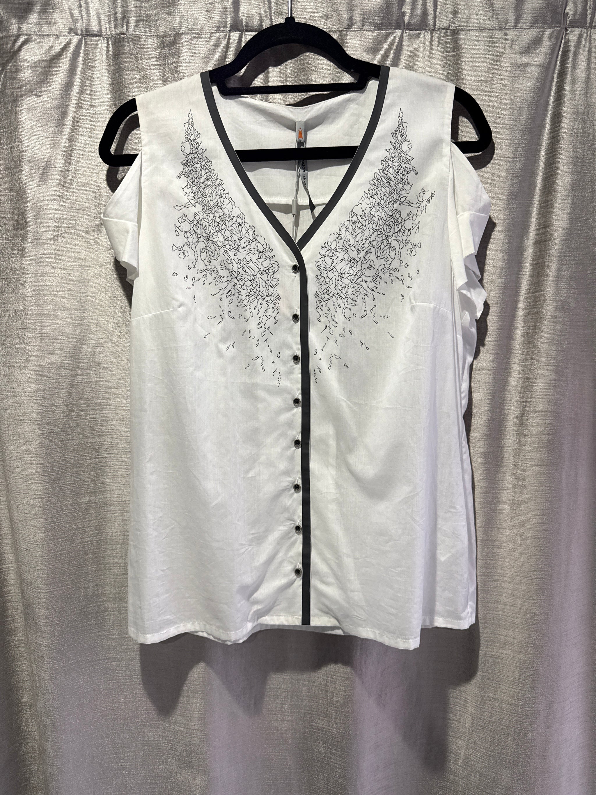 Light and sheer sleeveless button-up collar top. Triompher features a light, contrasting outline and a cutout in the back. The garment has a flowy cut...