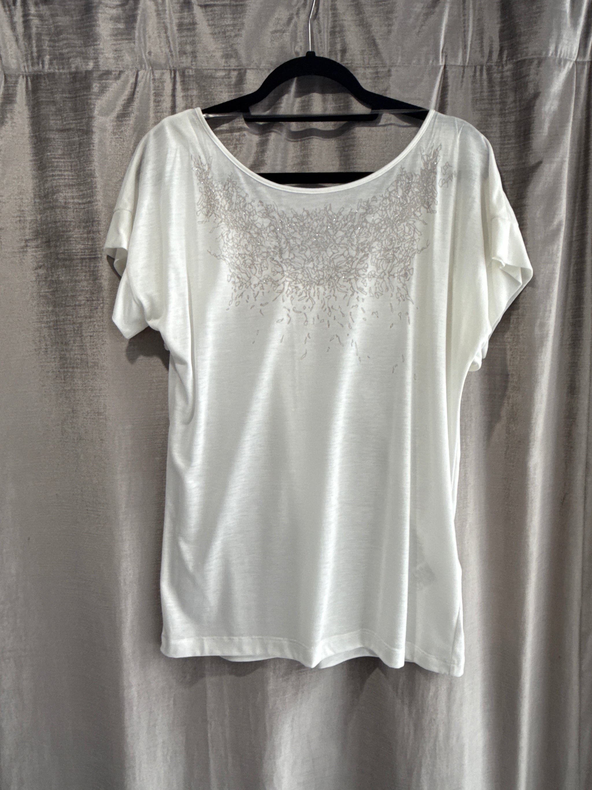 Delicate short sleeve top, featuring a round neckline with entwined metal chain detail. Small, textured metal logo on the left arm. Material: 100% Linen