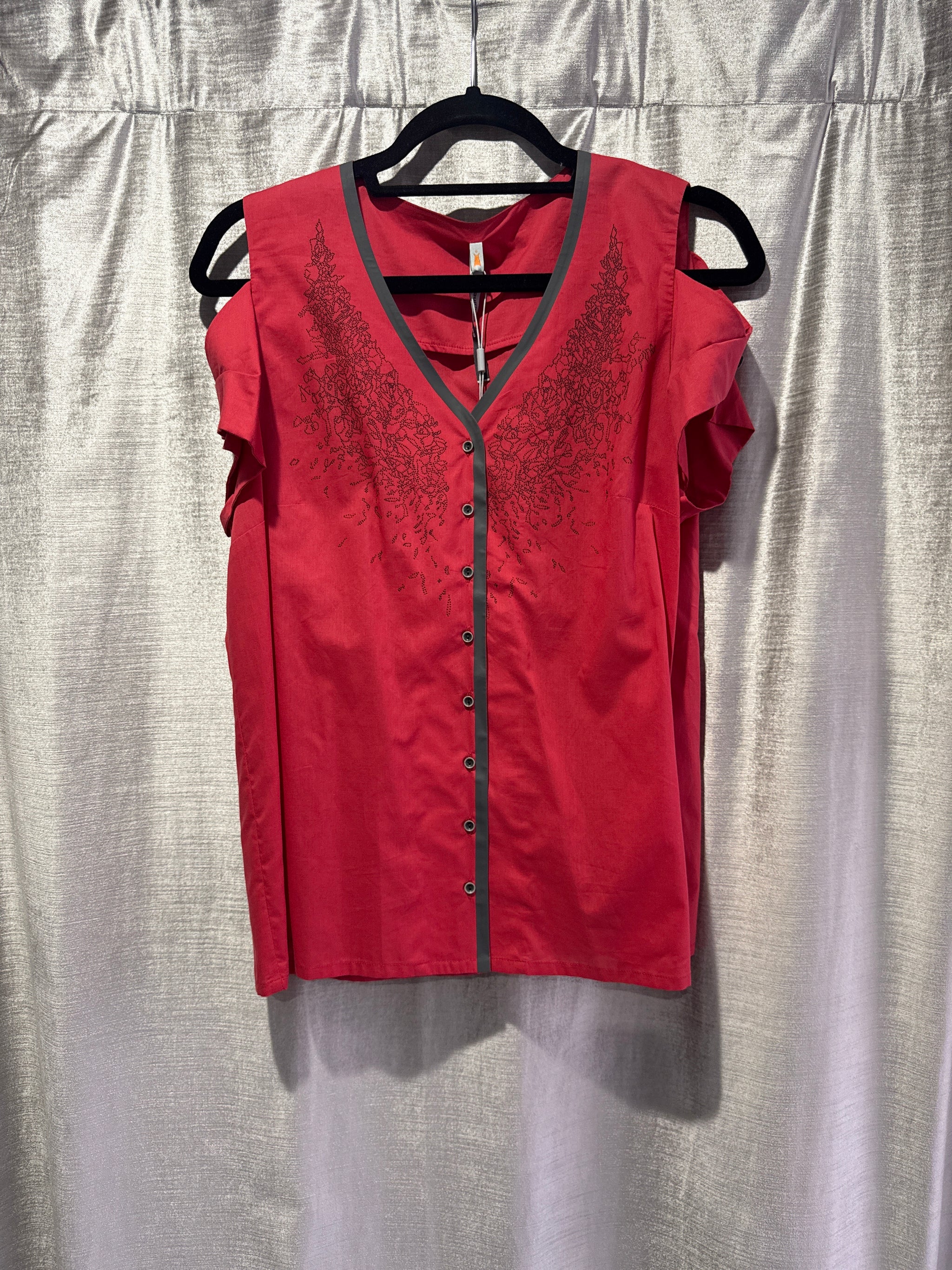 A double layered top with 3/4th sleeves and snap buttons in the back.