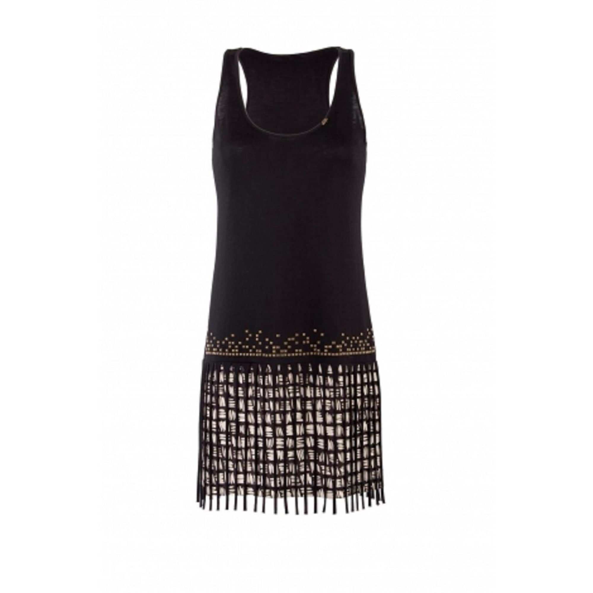 Light tank dress done in a T-shirt like material with fringe at the bottom. Materials: Cotton & Lycra