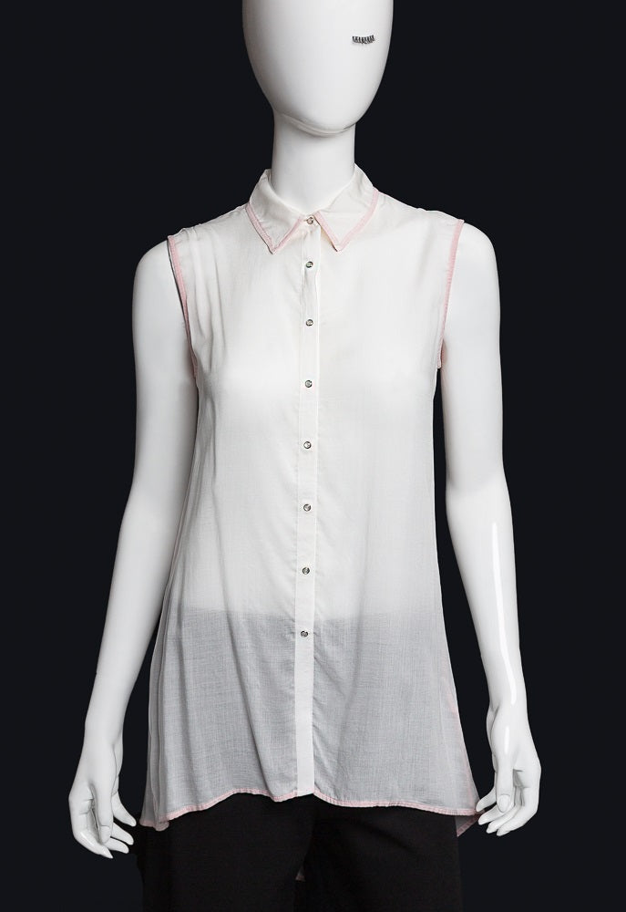 Light and sheer sleeveless button-up collar top. Triompher features a light, contrasting outline and a cutout in the back. The garment has a flowy cut...