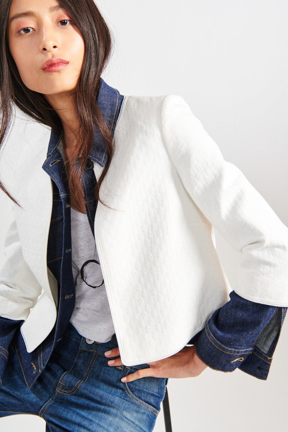 Two-tone hi-lo sweater. Materials: 48% Virgin Wool, 48% Polyacrylic, 4% Cotton